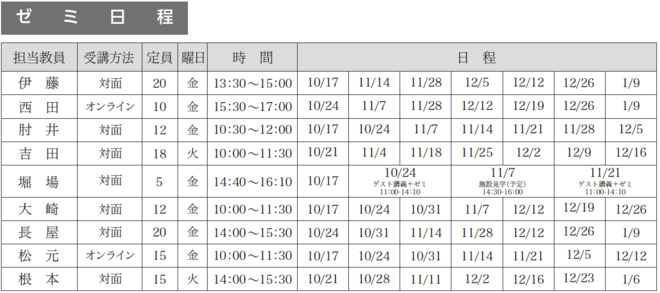 なお、担当教員の都合により日程変更等がある場合がありますので、ご了承ください。