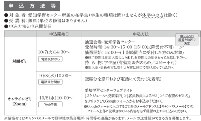 10月8日(水)午前10時以降に「ご希望のゼミ名」をクリックしていただき、申込フォームをご入力の上、送信してください。