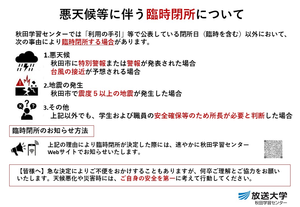 秋田学習センターでは「利用の手引」等で公表している閉所日(臨時を含む)以外において、悪天候等により臨時閉所する場合があります。詳細はこちらをご覧ください。