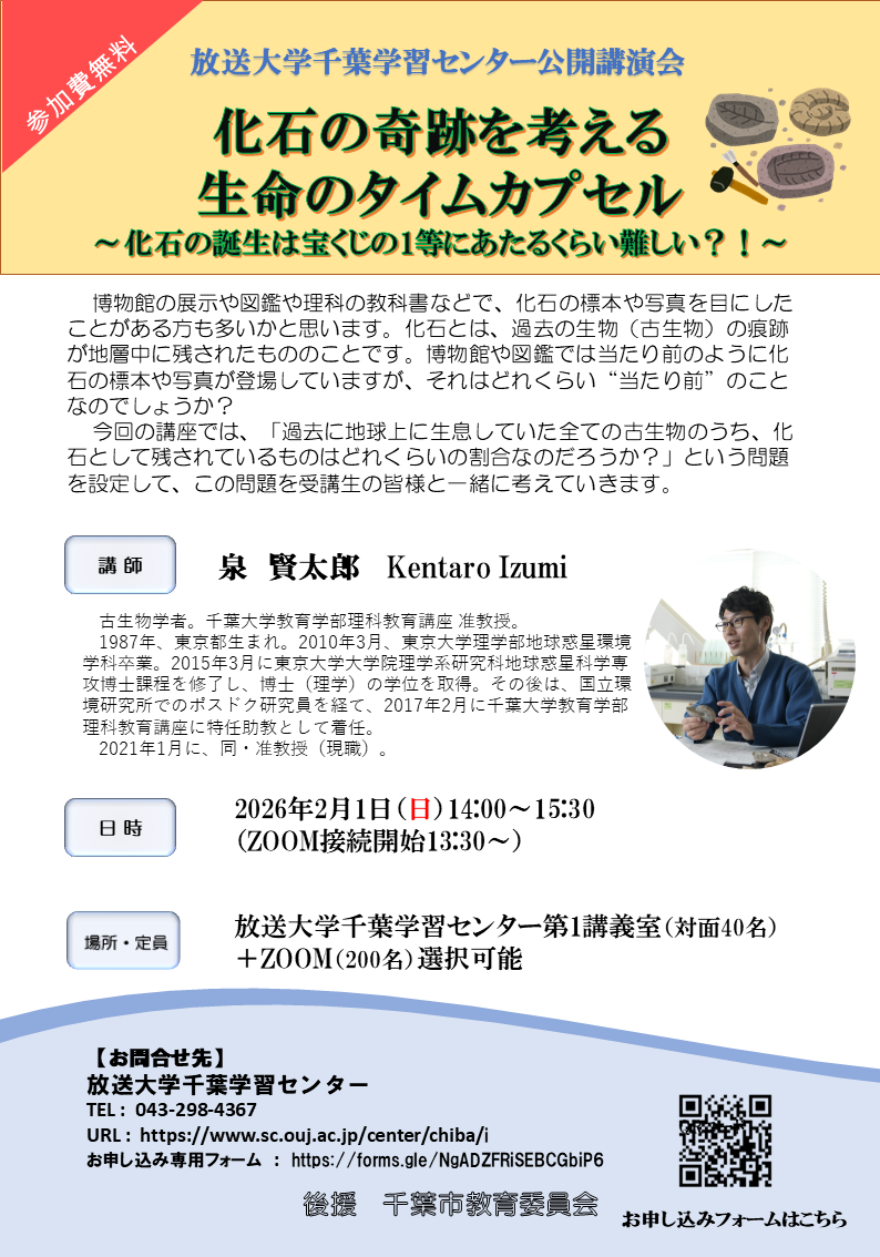 【2/1(日)公開講演会のご案内】泉賢太郎先生「化石の奇跡を考える 生命のタイムカプセル~化石の誕生は宝くじの1等に当たるくらい難しい?!~」【参加無料】