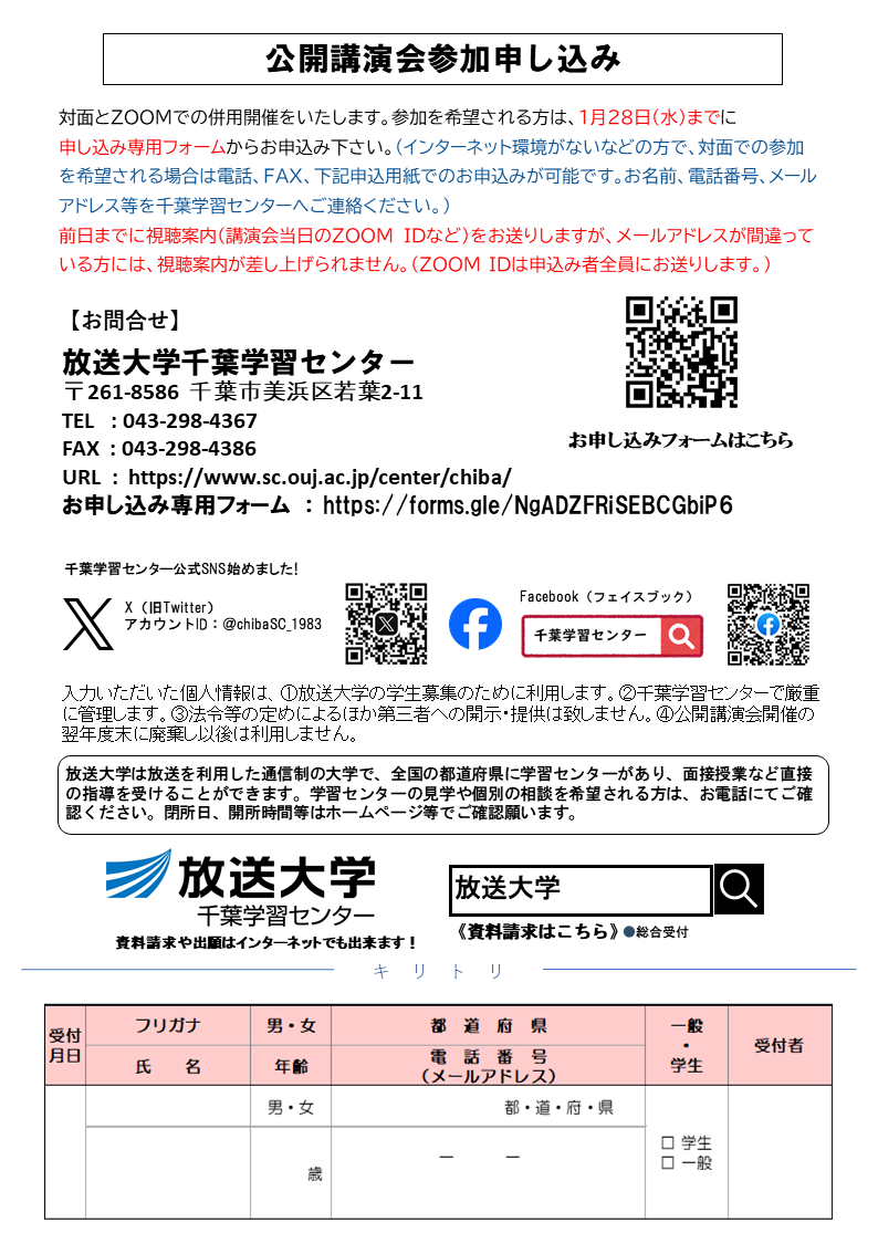 (インターネット環境がないなどの方で、対面での参加を希望される場合は、電話、FAX、申し込み用紙でのお申込みが可能です。お名前、電話番号、メールアドレス等を千葉学習センターへご連絡ください。)