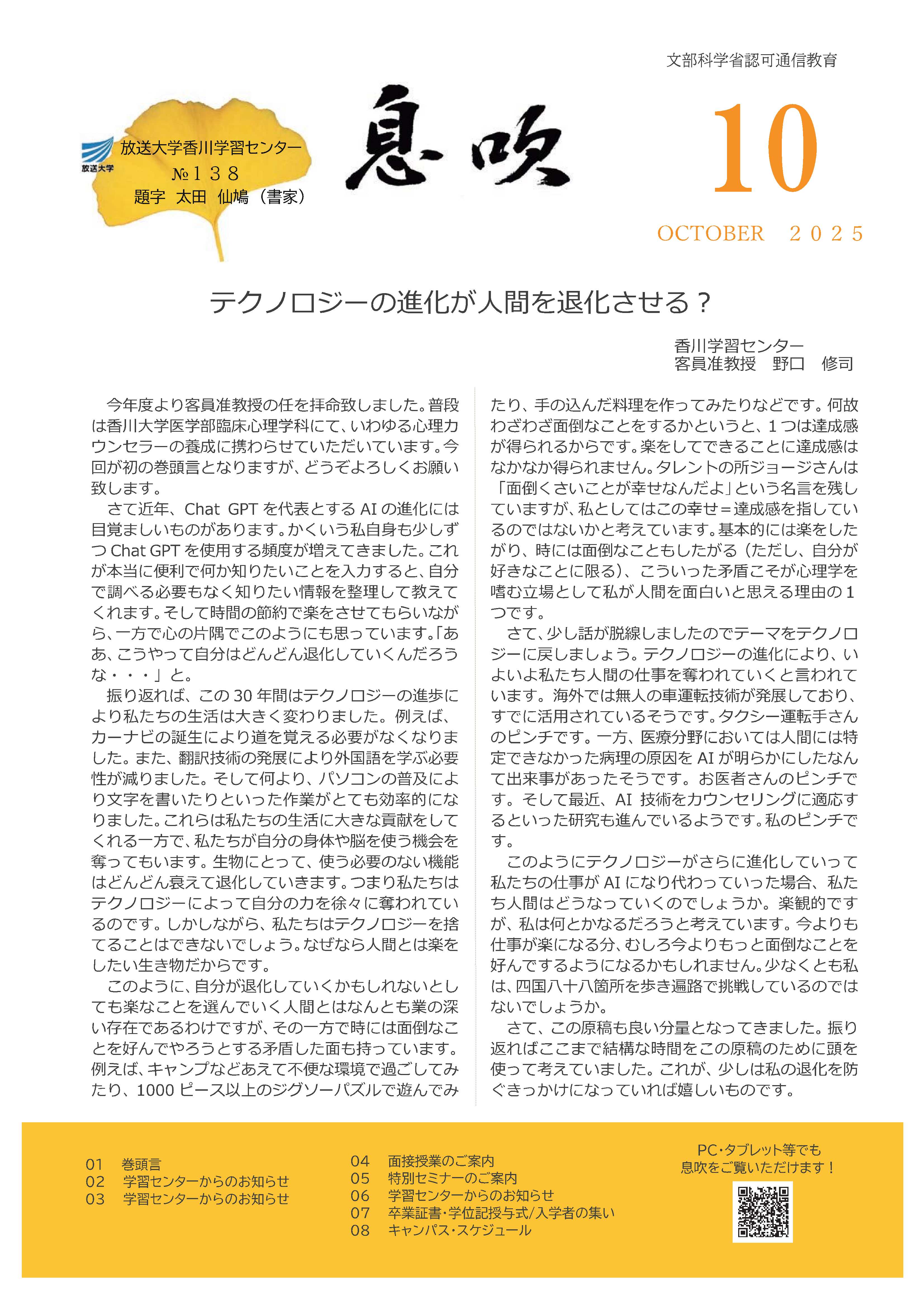 香川学習センターの機関紙『息吹』は、年4回(4月、7月、10月、1月)発行しています。 試験や学習に関する大切なお知らせを掲載していますので、必ず一読してください。
