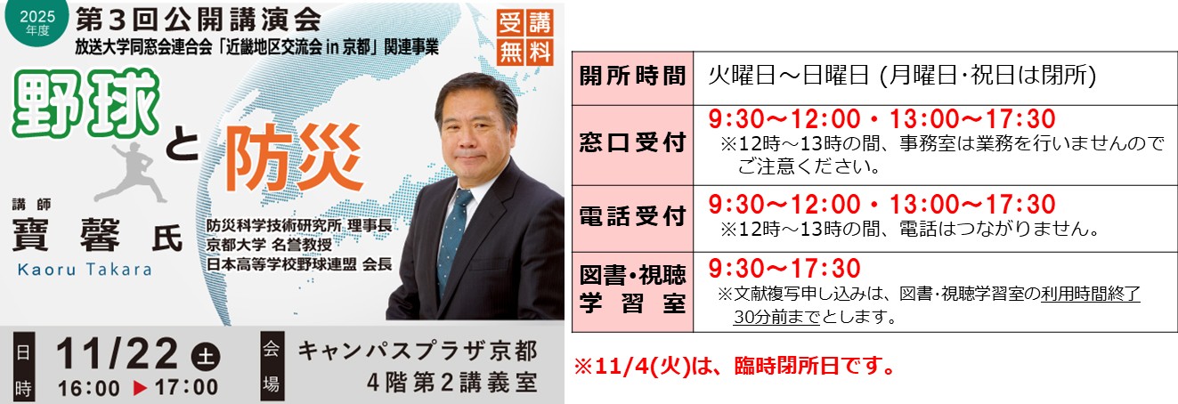京都学習センターの情報が発信されており、単位認定試験や面接授業についてのお知らせ、学習懇談会・特別講義の日程、事務室からのお知らせなどをご案内しています。