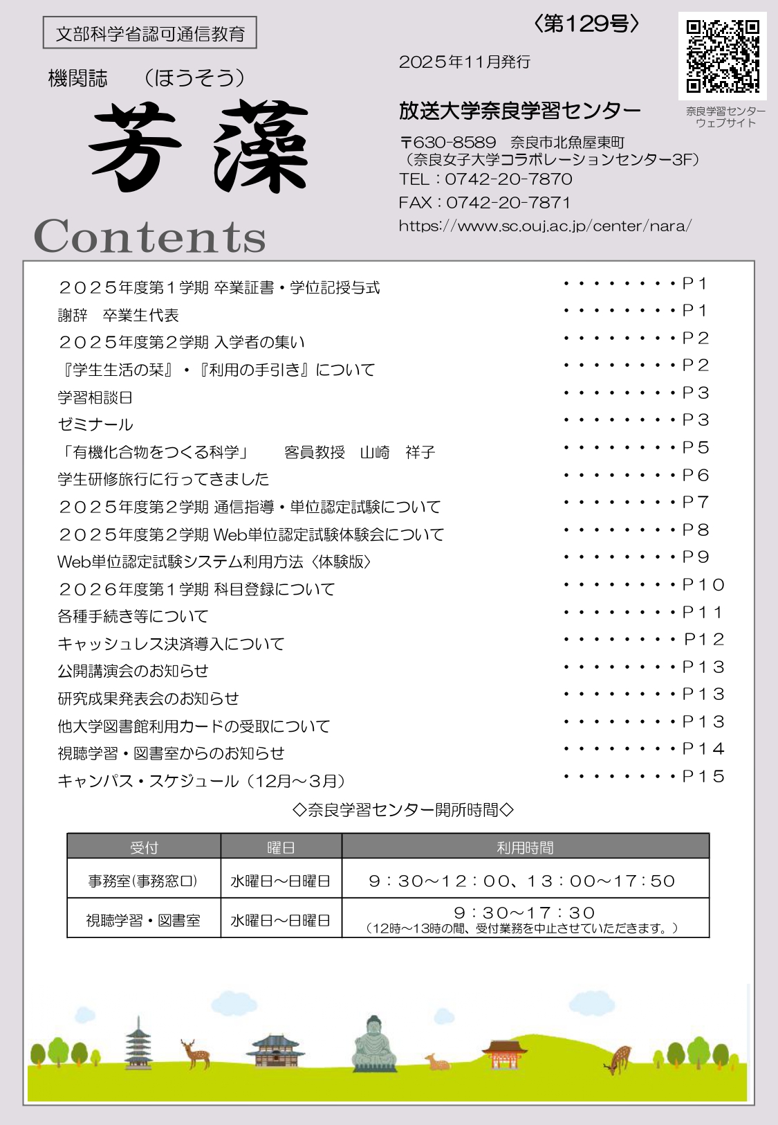 奈良学習センターでは、3月、5月、9月、11月の年4回機関誌「芳藻(ほうそう)」を発行しています。「芳藻」の名称は、奈良に相応しいものとして、万葉集から選んだものです。「芳藻」は、万葉集巻五に「跪きて封函を開き拝みて芳藻を讀む」とあります。遙か離れた故郷からの便りをありがたく拝んで読んでいたことを述べており、芳藻は便りを表しています。放送大学の「ほうそう」にも通じており、センターと学生を結ぶ絆としての役目も果たしてくれるものとして、名付けられたものです。