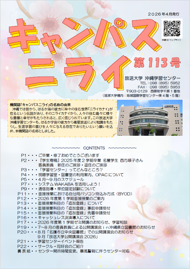 「キャンパスニライ」は、沖縄学習センターが発行する機関誌で、 4月、10月の年2回発行しています。
