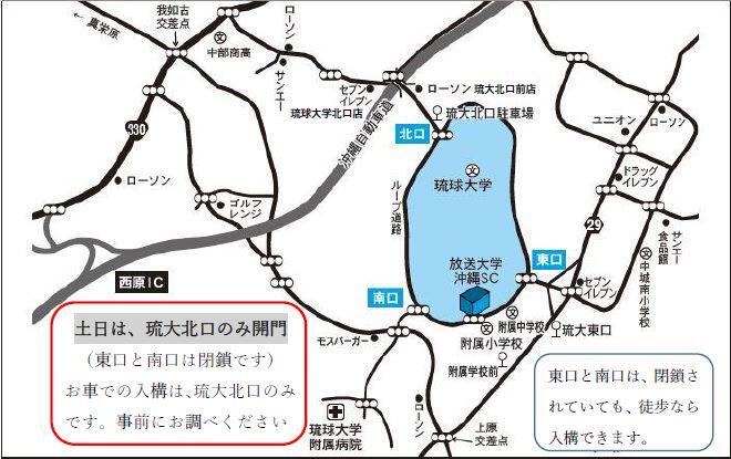 那覇バスターミナルー牧志ー儀保ー琉大附属病院前ー琉大附属学校前(下車、徒歩約6分)ー琉大東口(下車、徒歩約10分)ー琉大北口駐車場(終点下車、徒歩約15分)
