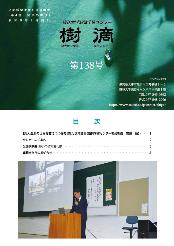 滋賀学習センターでは、機関誌『樹滴』を発行し、センター所属学生に配付しています。内容は所長・客員教員のあいさつ・随感、行事報告、セミナー・公開講座の案内、事務室からのお知らせです。