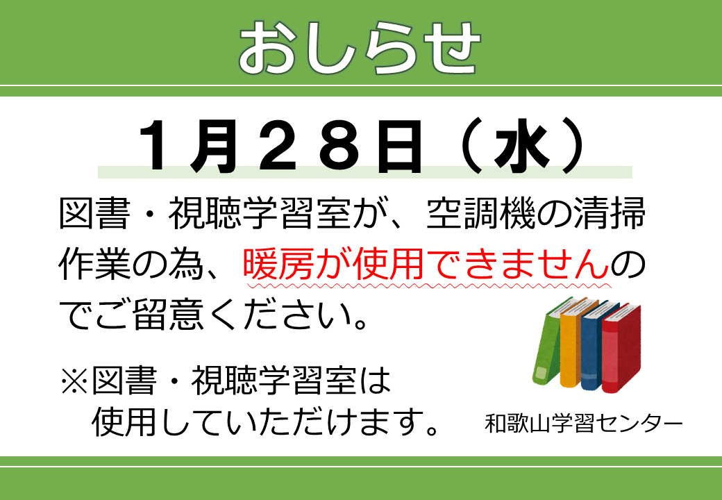 上記日程で図書・視聴学習室の空調機の清掃作業を行うため、 暖房が使用できません。ご留意ください。 ※図書・視聴学習室は使用していただけます。