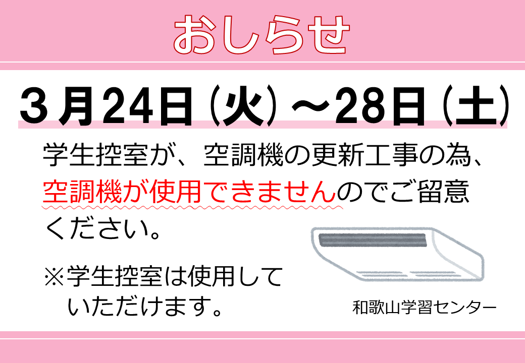 上記日程で学控室室の空調機更新工事を行うため、空調機を使用できません。ご留意ください。 ※学生控室は使用していただけます。