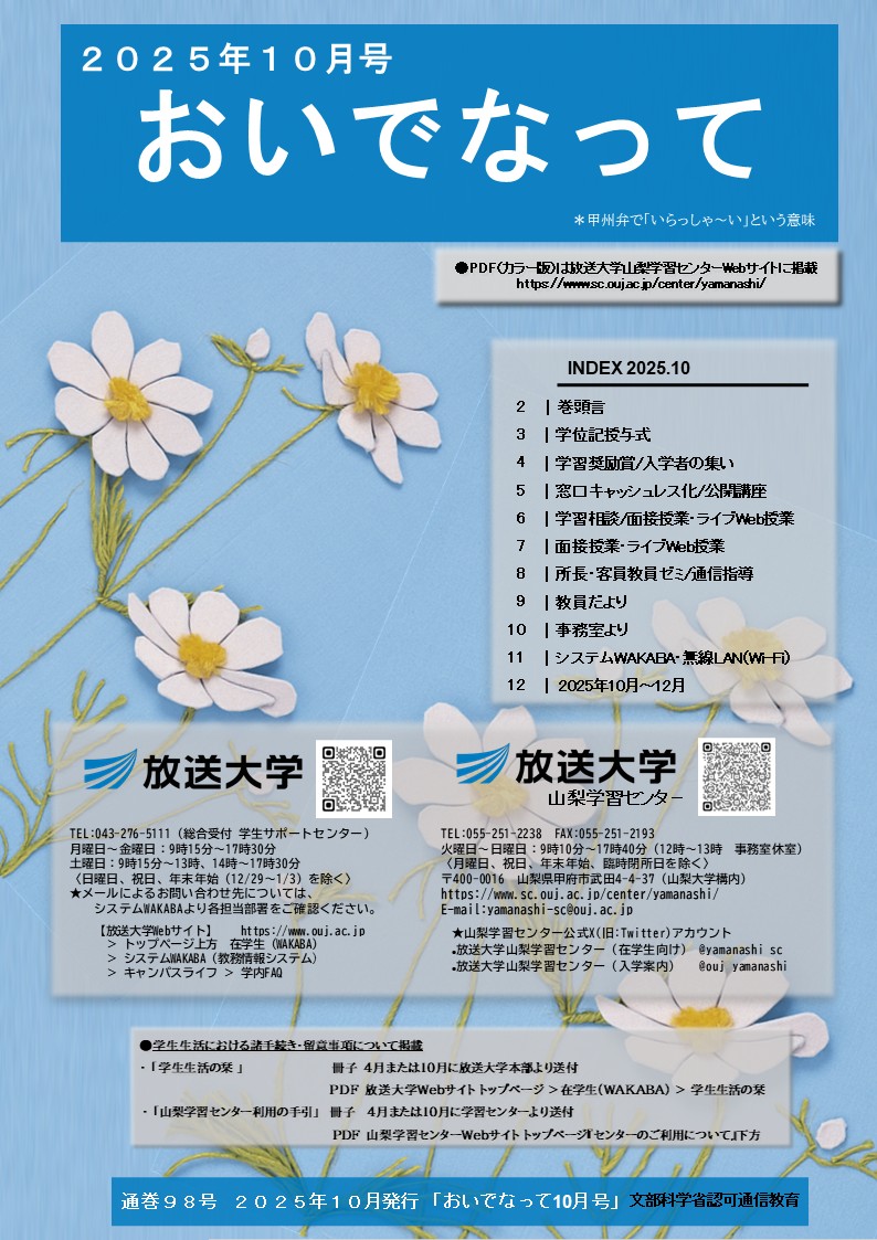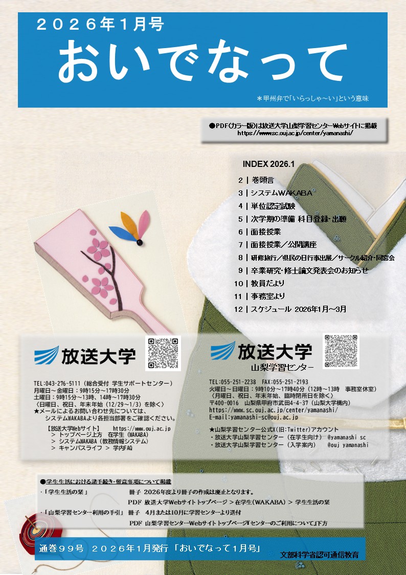 山梨学習センターだより「おいでなって」(甲州弁で「いらっしゃ~い」という意味です)は山梨学習センターが年4回(4月、7月、10月、1月)発行している機関誌です。 内容は、修学上のお知らせや報告、山梨学習センターの行事および日程等、さまざまな情報をお伝えしています。詳しくは『機関誌紹介』をご覧ください。