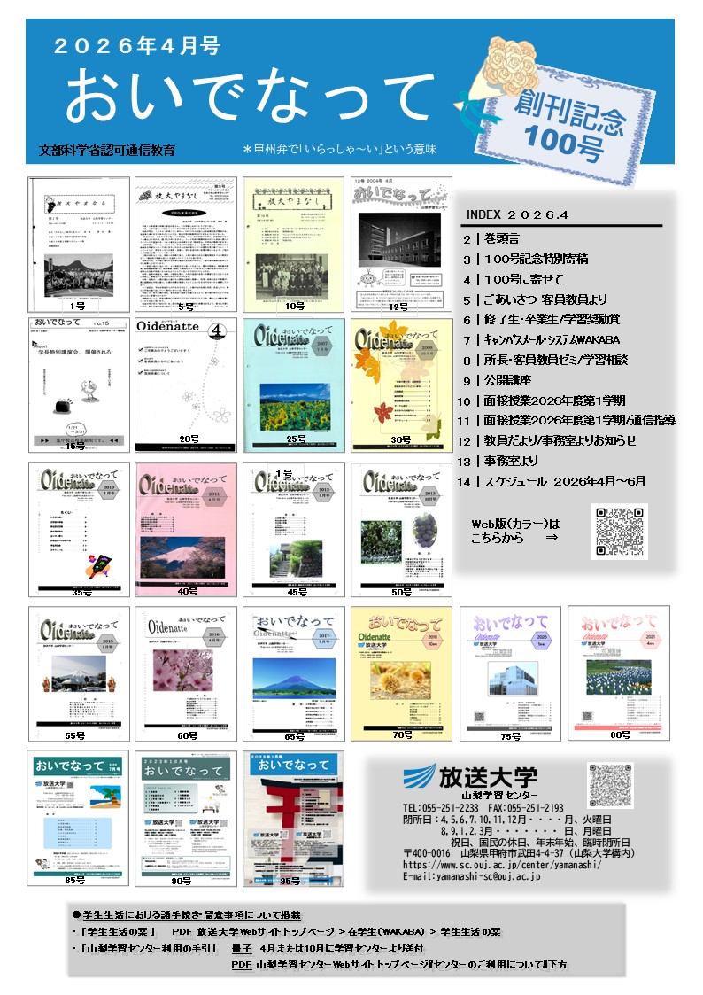 山梨学習センターでは、3ヶ月に1度、機関誌「おいでなって」を発行しています。